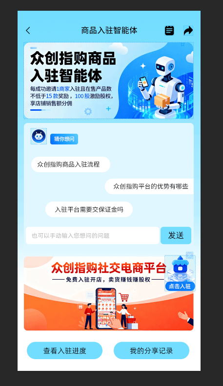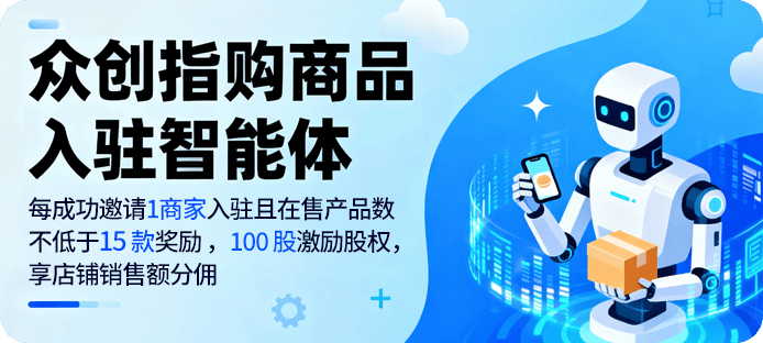 依托众创指购99项软著学问产权建立的硬核手艺底座,让合股人无需复杂前提,就能即刻获得保举商家入驻的资历。客服早已下班……众创指购商家入驻AI智能体,若是身边有想入驻电商平台的商家伴侣,专为商家打制的万能帮手,就能轻松将人脉为收益取激励股权,凌晨有疑问想征询,赔股收益无上限。更是你赔本的黄金桥梁。
